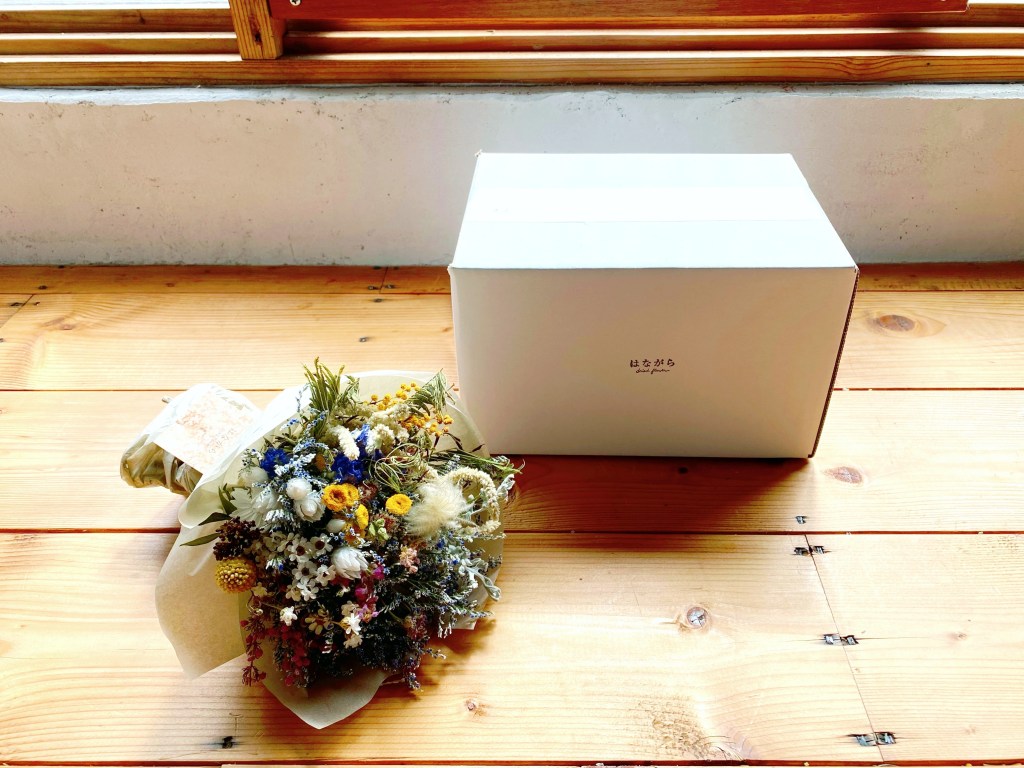 はながらの小花系のミニブーケをお入れして、特製ボックスにして配送いたします。